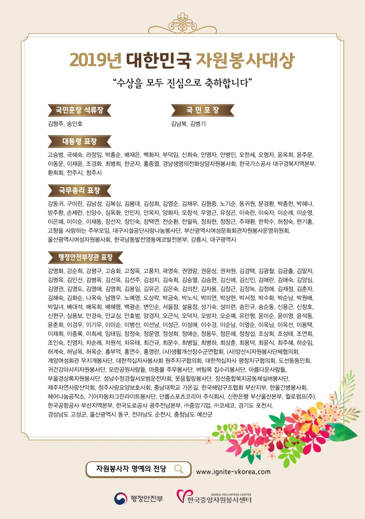 수상자 2019년 대한민국 자원봉사대상 수상자 명단 2021.06.30 관리자 ? 191223_대한민국자원봉사대상_사례집_내지(최종V2.0).pdf 이전글 2020년 대한민국 자원봉사대상 수상자 명단 목록 다음글 2018년 대한민국 자원봉사 대상 수상자 명단