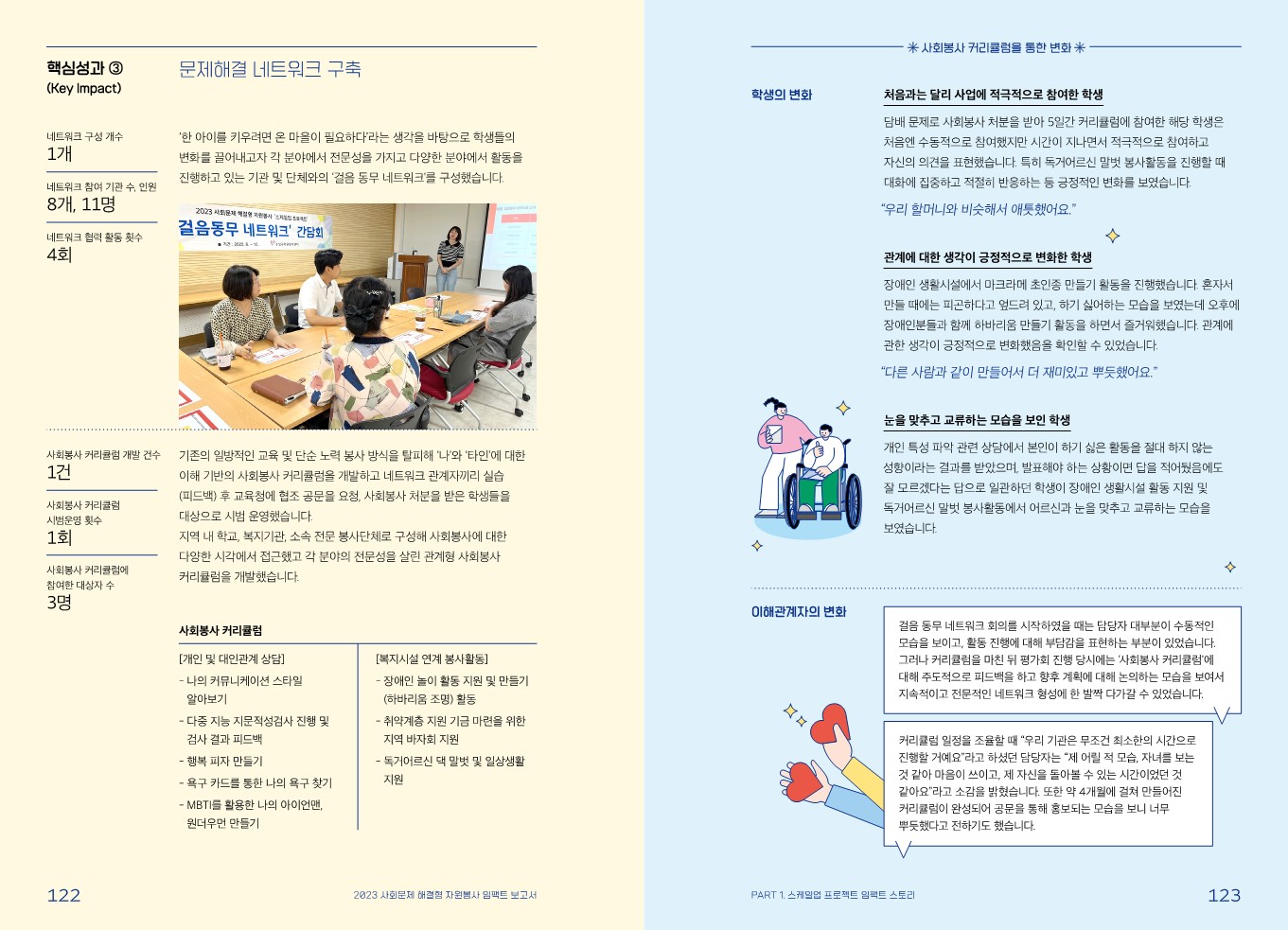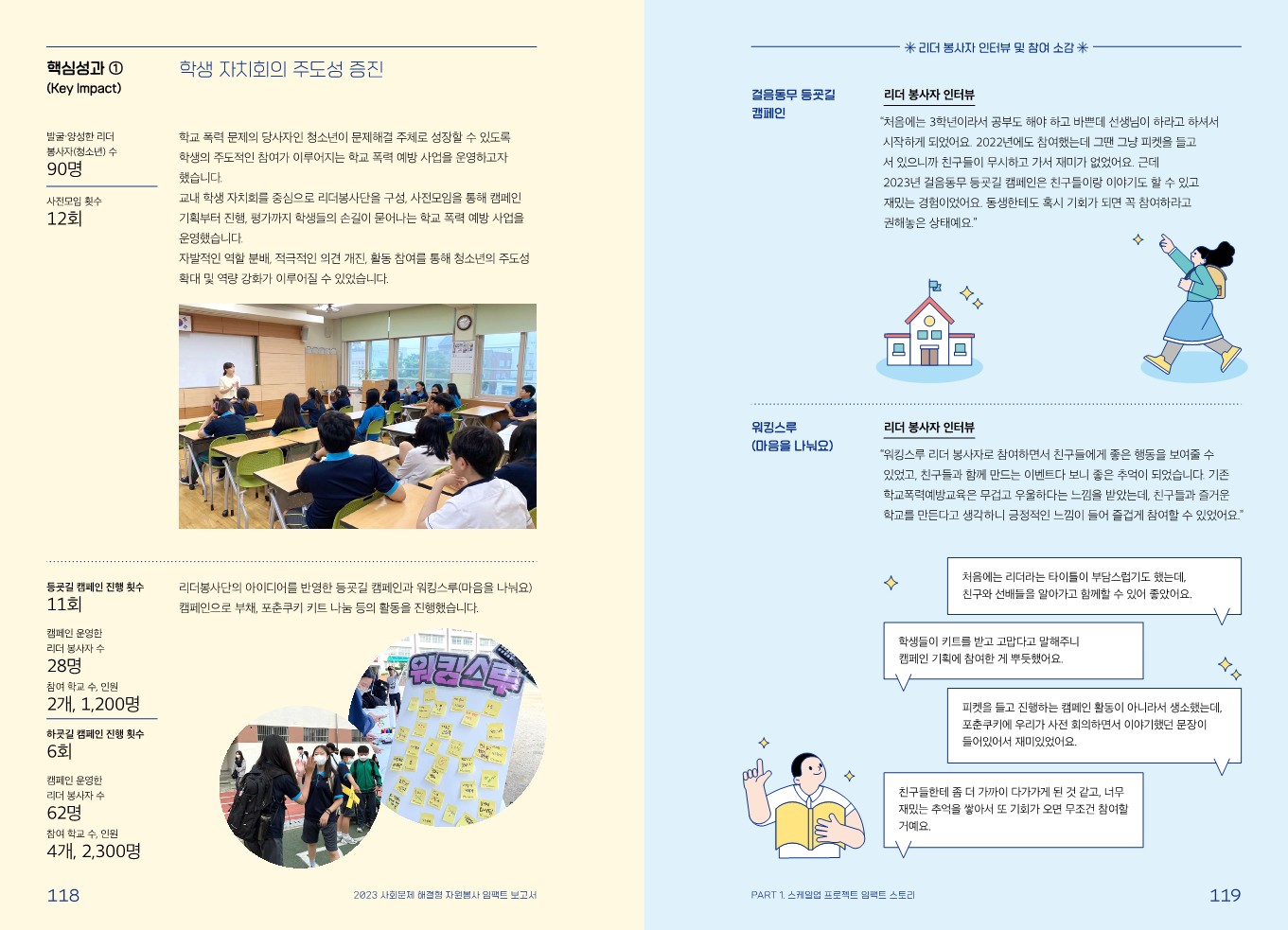 임팩트 스토리 [스케일업 프로젝트] 즐거운 학교 만들기 프로젝트! 학교 폭력 예방 사업 ‘걸음 동무’ 관리자 2024.02.08 459 이전글 [스케일업 프로젝트] 대학가 쓰레기 불법투기 개선을 위한 청년들아, 치워랍(Cheer up)! 목록 다음글 [스케일업 프로젝트] 주민 주도적 안전마을 조성 사업 '마을을, 잇(it)다(all)' : 연결하다