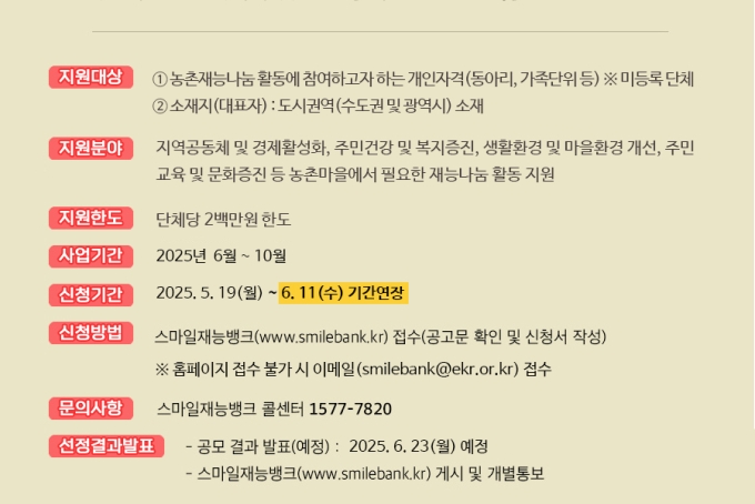[홍보] 2025년도 농촌재능나눔(농촌맞춤형봉사활동지원) 개인자격 활동지원사업 공모(기간연장)