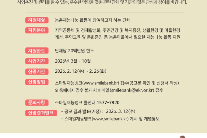 [모집] 2025년 농촌재능나눔(농촌맞춤형 봉사활동지원) 단체 활동지원사업 공모 안내