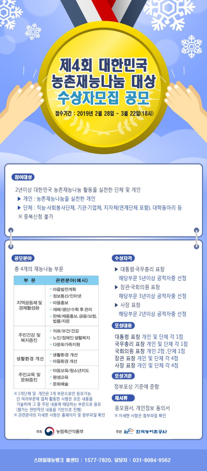 정보공유 [홍보] 제4회 대한민국 농촌재능나눔 대상 수상자 모집 공모 관리자 2019.03.08 2246 ※ 접수 및 자세한 내용은 https://www.smilebank.kr/award/lay2/S559T559C561/contents.do 를 통해 확인 하기시 바랍니다. 이전글 [홍보] 제100회 전국체육대회&제39회 전국장애인체육대회 자원봉사자 모집 목록 다음글 [홍보] 2019년 제2기 공무원 및 공공기관 직원 사이버 통일교육 수강 안내