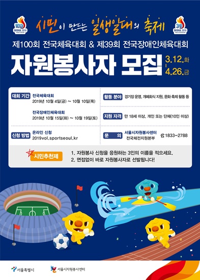 ▶ 더 자세한 모집 안내는 https://2019vol.sportseoul.kr/sports100/vlnt/apply/vlntApplyRecruitIntro.do 에서 확인이 가능합니다 !