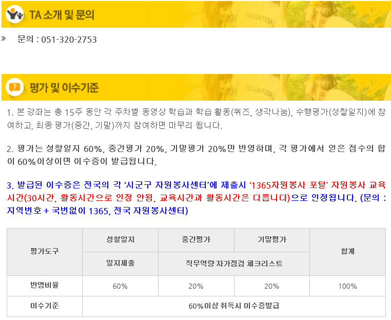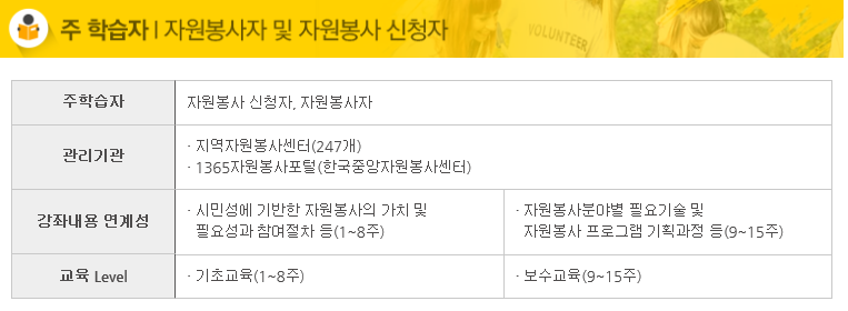 정보공유 [홍보] 온라인 자원봉사 시민교육 강좌 개설 안내 관리자 2019.07.15 2292 한국중앙자원봉사센터는 부신디지털대학교와 함께 온라인 자원봉사 시민교육 강좌를 개설하고 있습니다. 2019. 7. 1부터 진행되는 본 강좌에 수강을 희망하시는 분들은 이곳을 클릭하여 세부사항을 안내 받으시기 바랍니다. 이전글 [홍보] 2019 한국형 온라인 공개강좌(K-MOOC) ‘자원봉사 시민교육을 말하다’ 목록 다음글 [홍보] 우리 동네 환경개선 프로젝트 'HUG STREET' 참가 안내