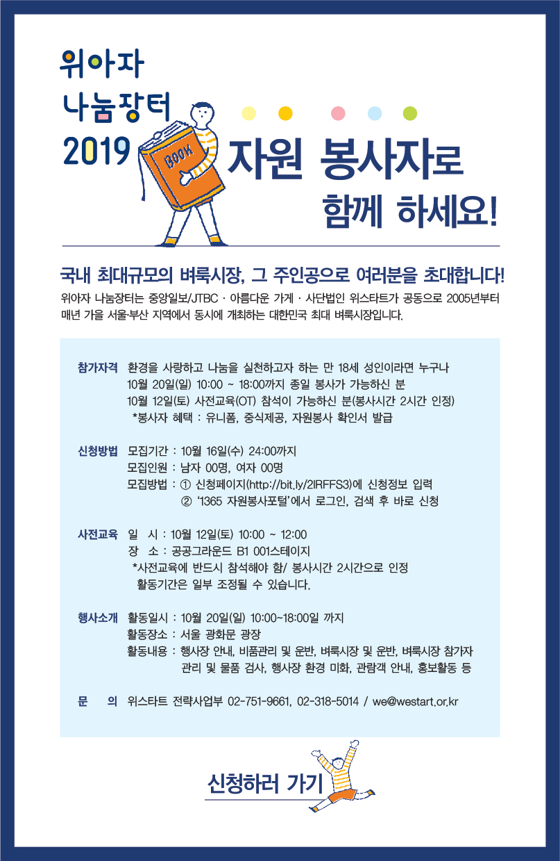 정보공유 [홍보] 위아자 나눔장터 2019 자원봉사자 모집 관리자 2019.09.20 2842 이전글 [공지] 은둔환자 의료지원 캠페인 목록 다음글 [홍보] 2019 한국형 온라인 공개강좌(K-MOOC) ‘자원봉사 시민교육을 말하다’