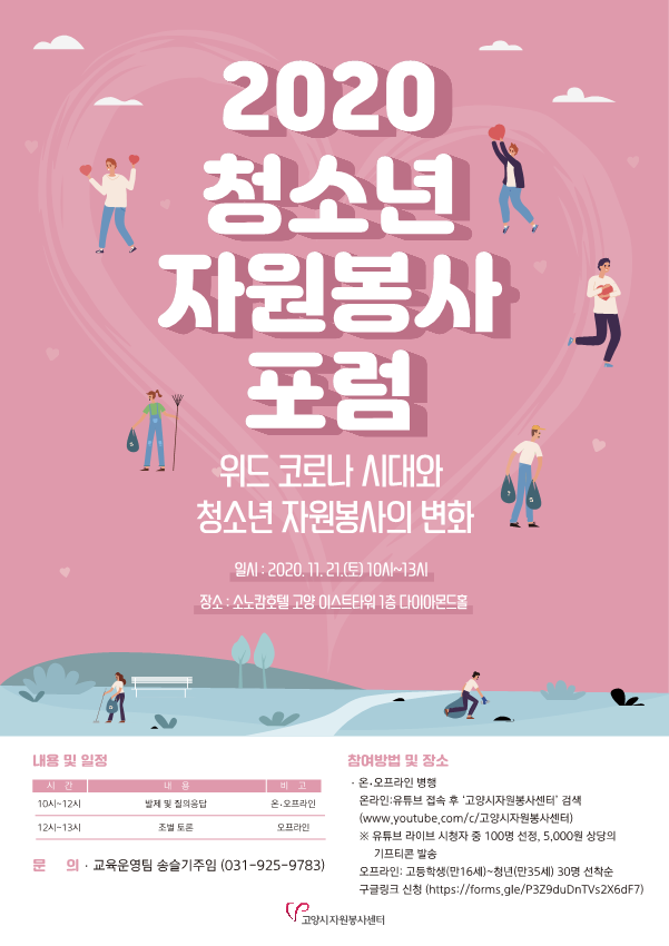 정보공유 [홍보] 2020 청소년 자원봉사 포럼 ‘위드코로나 시대와 청소년 자원봉사활동의 변화’ 관리자 2020.11.10 1740 이전글 [홍보] 2020 모두 다 토론회 목록 다음글 [홍보] 청소년자원봉사활동 활성화를 위한 대국민 아이디어 공모전