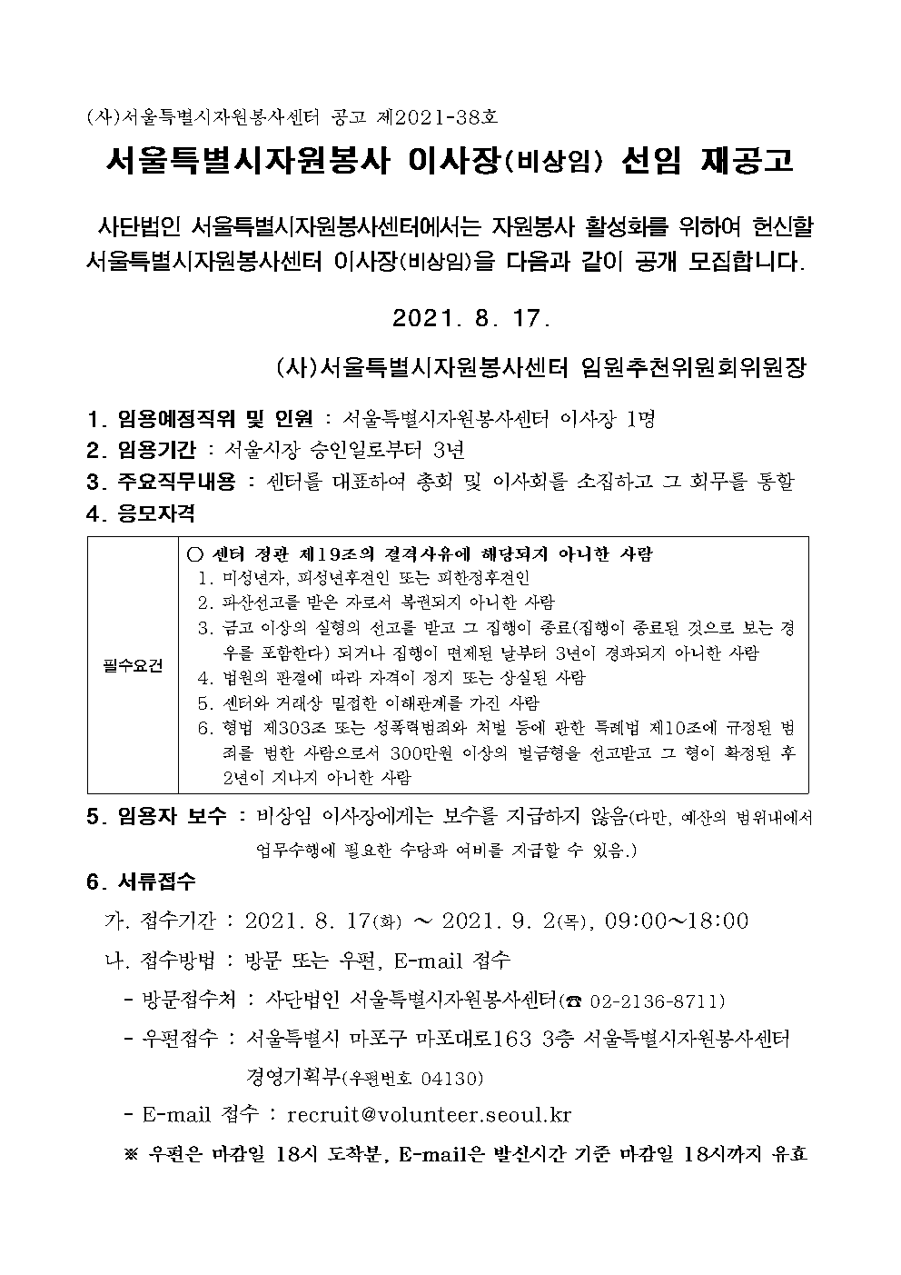 정보공유 [홍보] (사)서울특별시자원봉사센터 이사장 선임 공고 관리자 2021.08.17 1773 이전글 [홍보] 2021 전국생활체육대축전 자원봉사자 모집 목록 다음글 [홍보] 제12회 태평양공익인권상 수상후보 추천