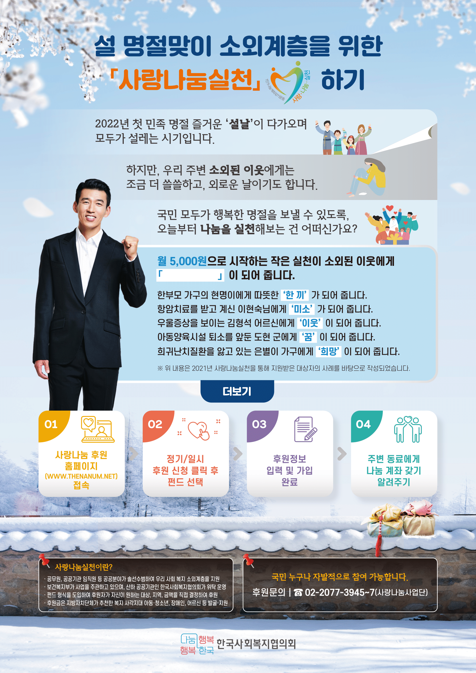 정보공유 [홍보] 설 명절맞이 소외계층을 위한 1인 1나눔 실천하기 관리자 2022.01.20 1473 이전글 [홍보] 2022년도 농촌재능나눔 지역단체 활동지원사업 공모 안내 목록 다음글 [홍보] 2021년 (사)한국자원봉사학회 후기 학술대회 참여 안내
