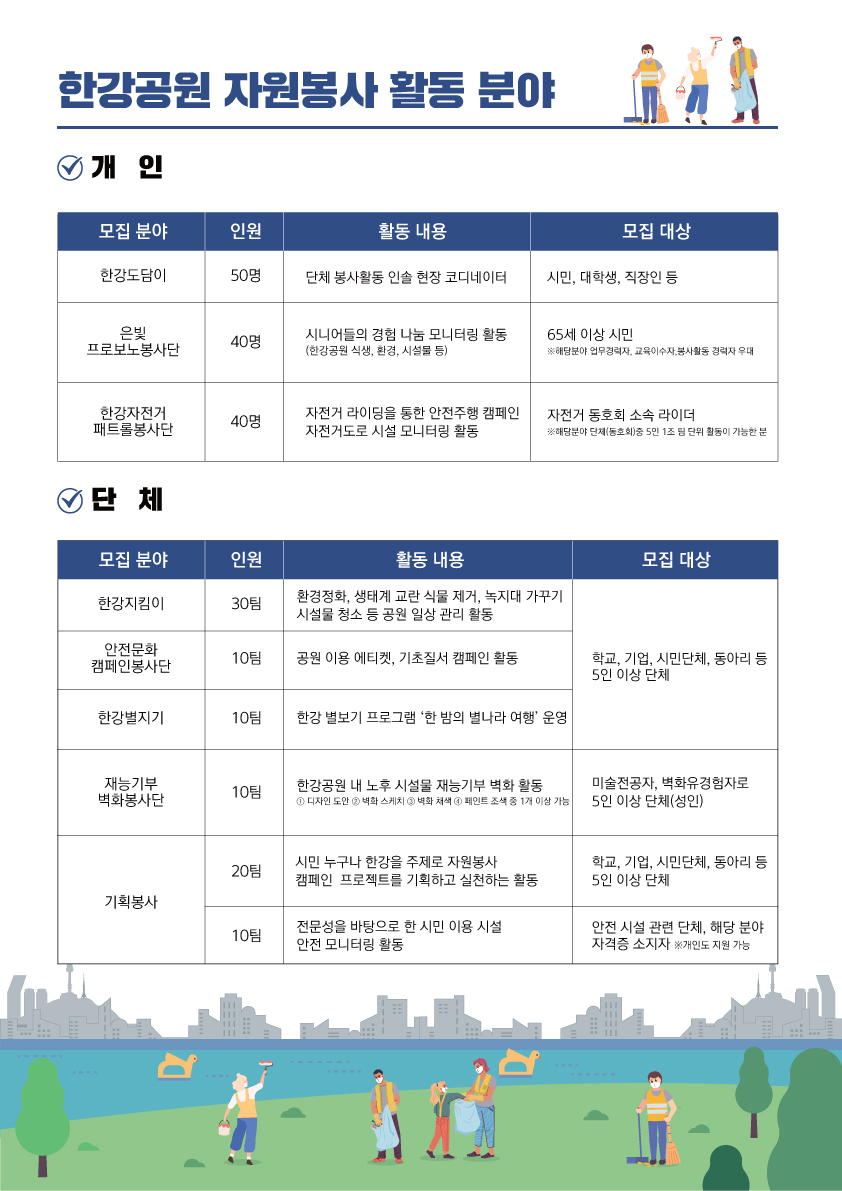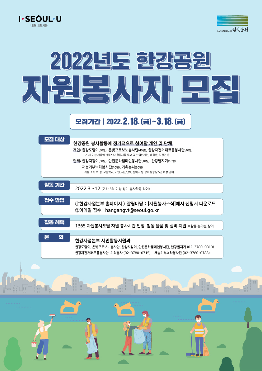 정보공유 [모집] 2022년도 한강공원 자원봉사자 모집 안내 관리자 2022.02.18 1715 이전글 [홍보] 제14회 전국 장애인 문학 공모전 안내 목록 다음글 [홍보] 제7회 대한민국 농촌재능나눔 대상 안내