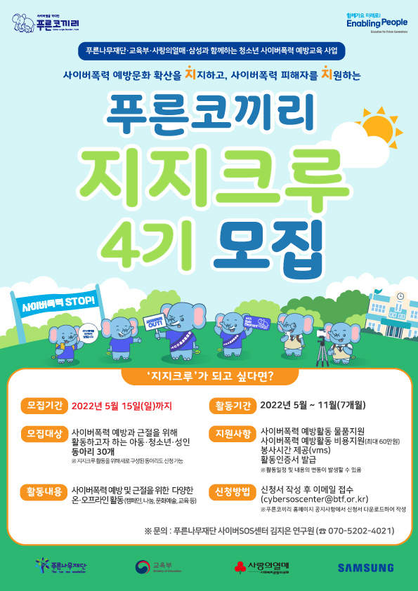 정보공유 [홍보] 2022 청소년 사이버폭력 예방교육 사업 "푸른코끼리" 지지크루(동아리) 모집 안내 관리자 2022.05.10 1295 이전글 [모집] 2022년 ‘꿈과 사람속으로’ 청소년해외자원봉사단 참가자 모집 안내 목록 다음글 [모집] 2022 대구컬러풀페스티벌 프로그램 참여자 모집 안내