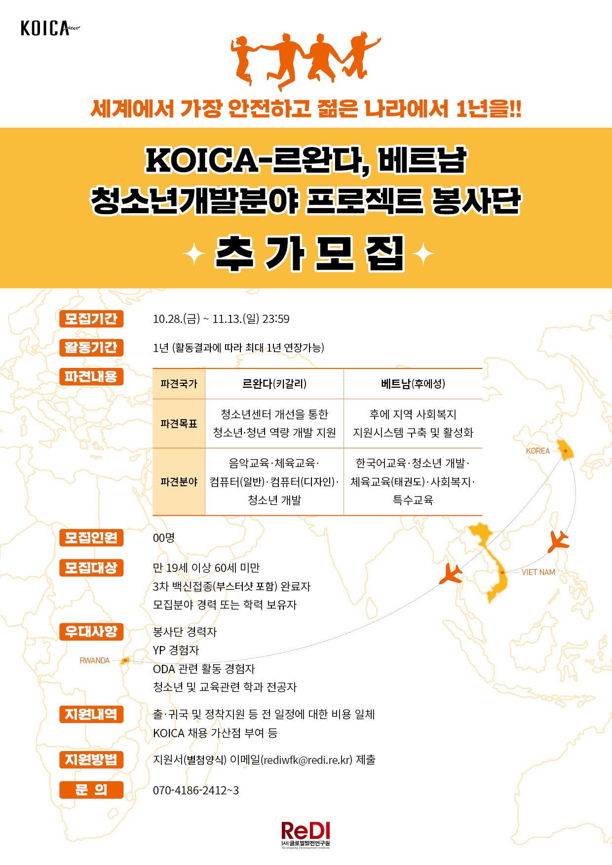 2022년 KOICA프로젝트봉사단(르완다, 베트남/청소년개발 분야) 추가모집 안내(~11/13(일) 23:59까지)
