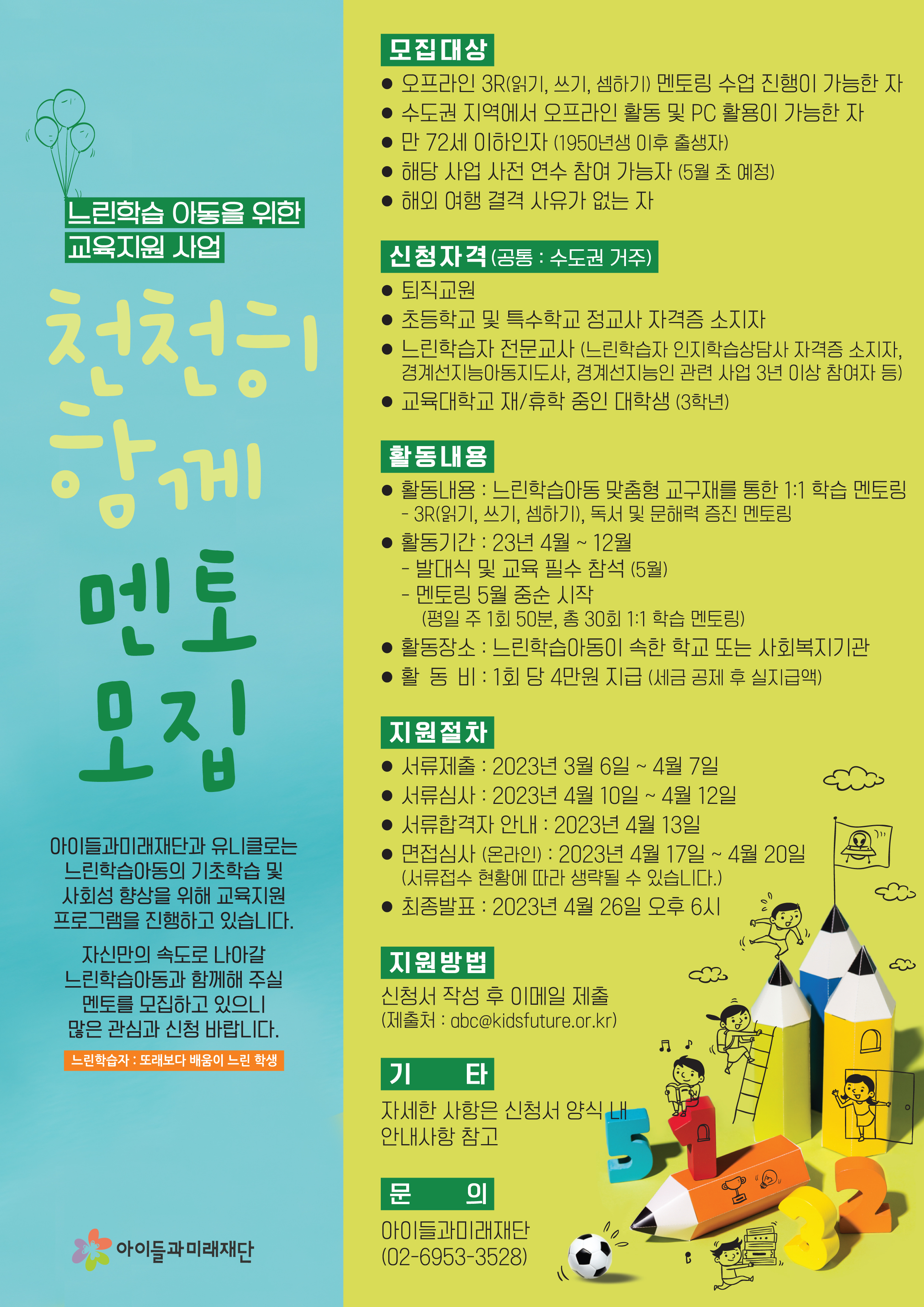 정보공유 [모집] 느린학습 아동을 위한 교육지원 사업 「천천히 함께 멘토」 모집 안내 관리자 2023.03.09 1330 이전글 [홍보] 제47회 청백 봉사상 후보자 공모 목록 다음글 [모집] 신중년 디지털 인지코치 활동 자원봉사자 모집 안내