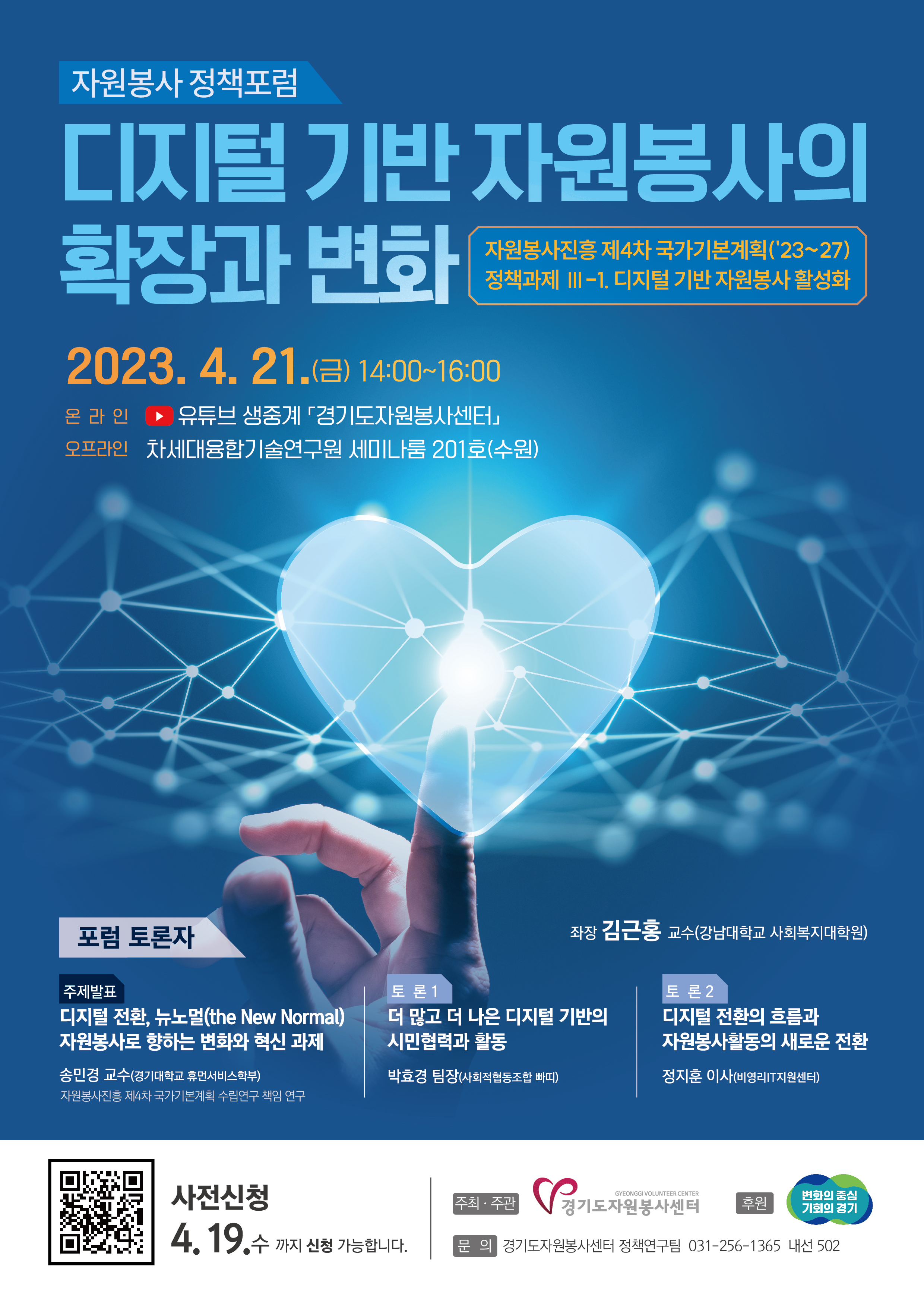 경기도자원봉사센터에서는 제4차 자원봉사진흥 국가기본계획 정책과제로 제시된 Ⅲ-1. 디지털 기반 자원봉사 활성화에 대한 실천적 담론을 공유하고자 합니다.