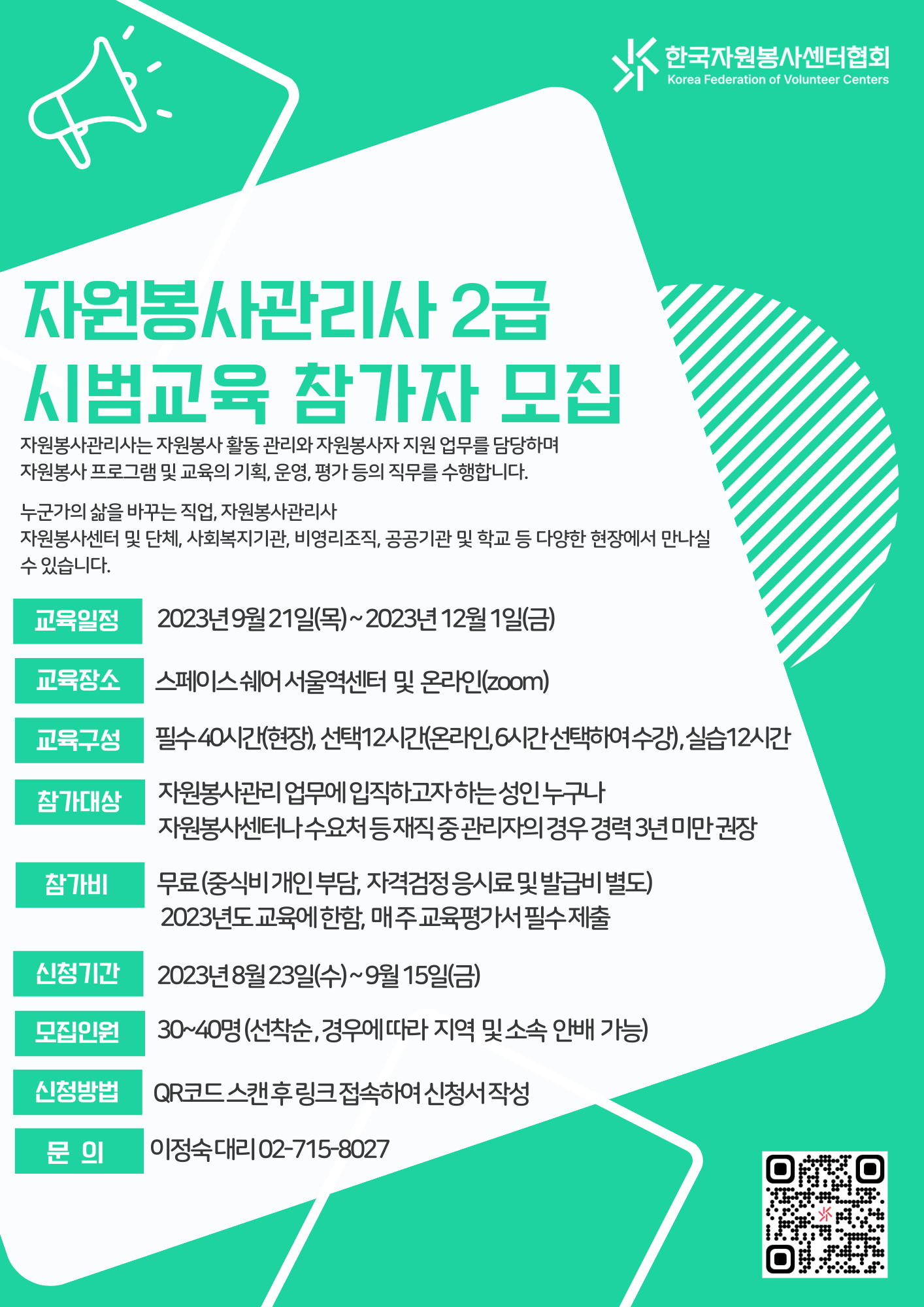 [홍보] 자원봉사관리사 2급 시범교육 참가자 모집 안내