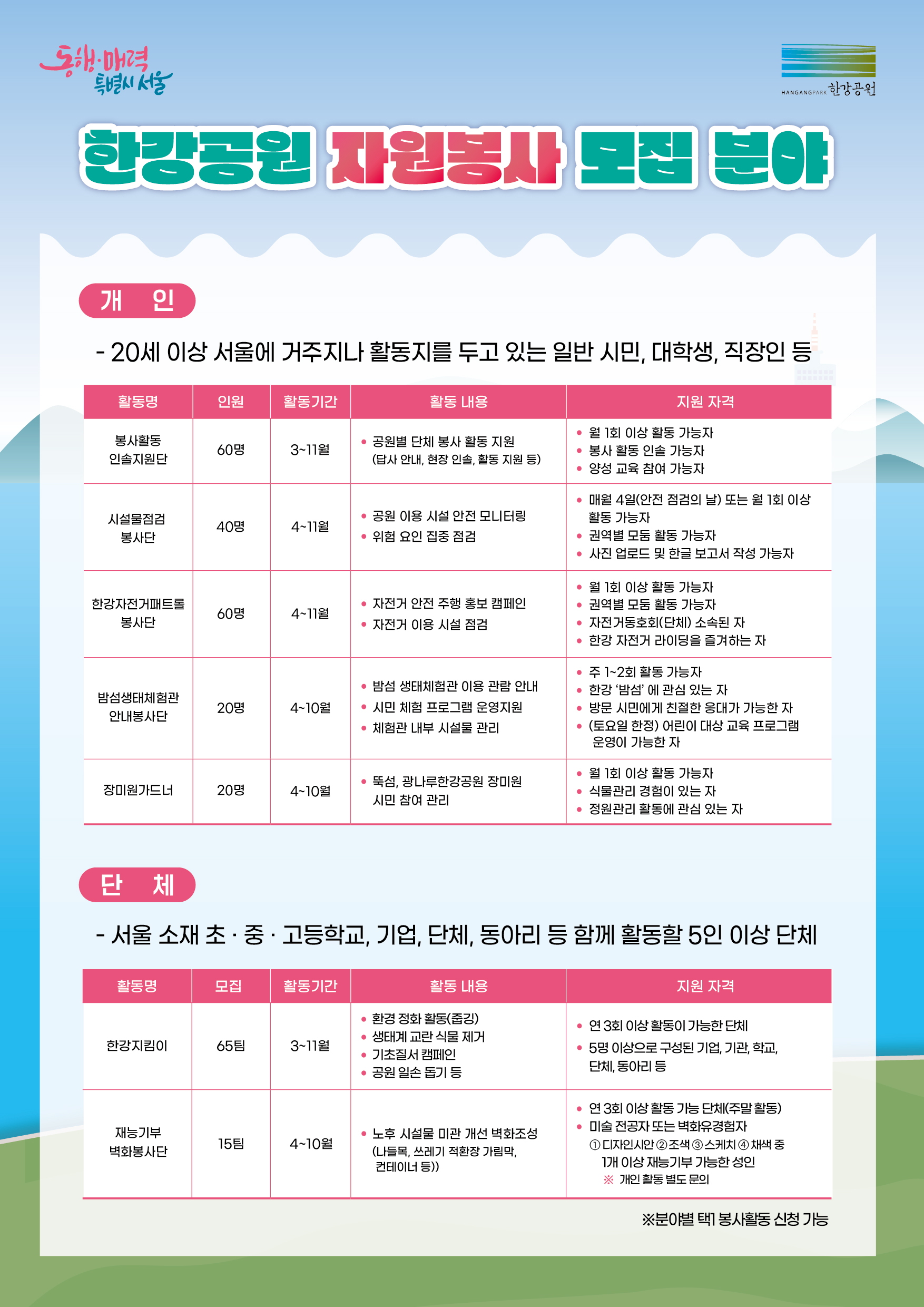 정보공유 [모집] 2024 한강공원 자원봉사자 모집 관리자 2024.02.20 1222 이전글 [홍보] 2024년도 농촌재능나눔(농촌맞춤형봉사활동지원) 일반/지역단체 활동지원사업 공모 목록 다음글 [공유] 스케일업 프로젝트 임팩트 보고서 발간 안내