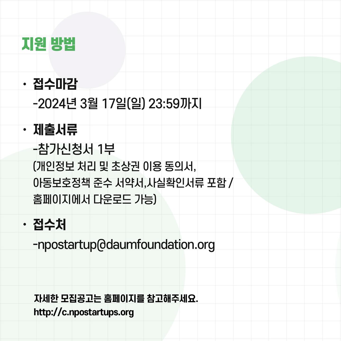 정보공유 [홍보] 2024 초록우산X다음세대재단 '아동・청소년 비영리스타트업 인큐베이팅 사업' 공고 관리자 2024.03.04 1276 이전글 [홍보] 2024년 WFK 청년봉사단 전문기관 프로그램 공모 목록 다음글 [홍보] 「2024 김해올래! 김해 볼런투어」 참가 신청(선착순 모집)