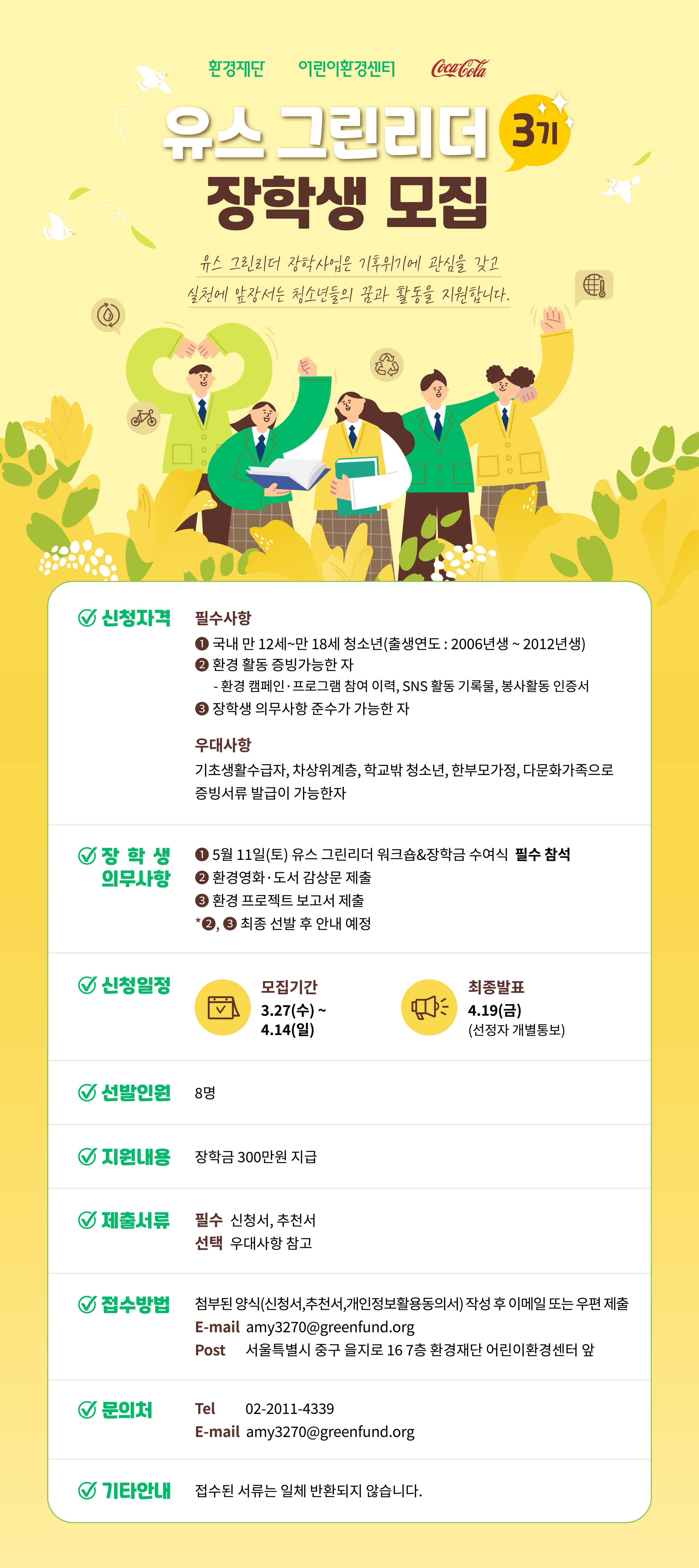 정보공유 [홍보] 청소년 장학사업 <유스 그린리더 3기> 관리자 2024.03.27 1200 이전글 [모집] 느린학습아동 교육지원사업 '천천히 함께' 참여 멘토 모집 목록 다음글 [홍보] 2024년 「제48회 청백봉사상」 공모