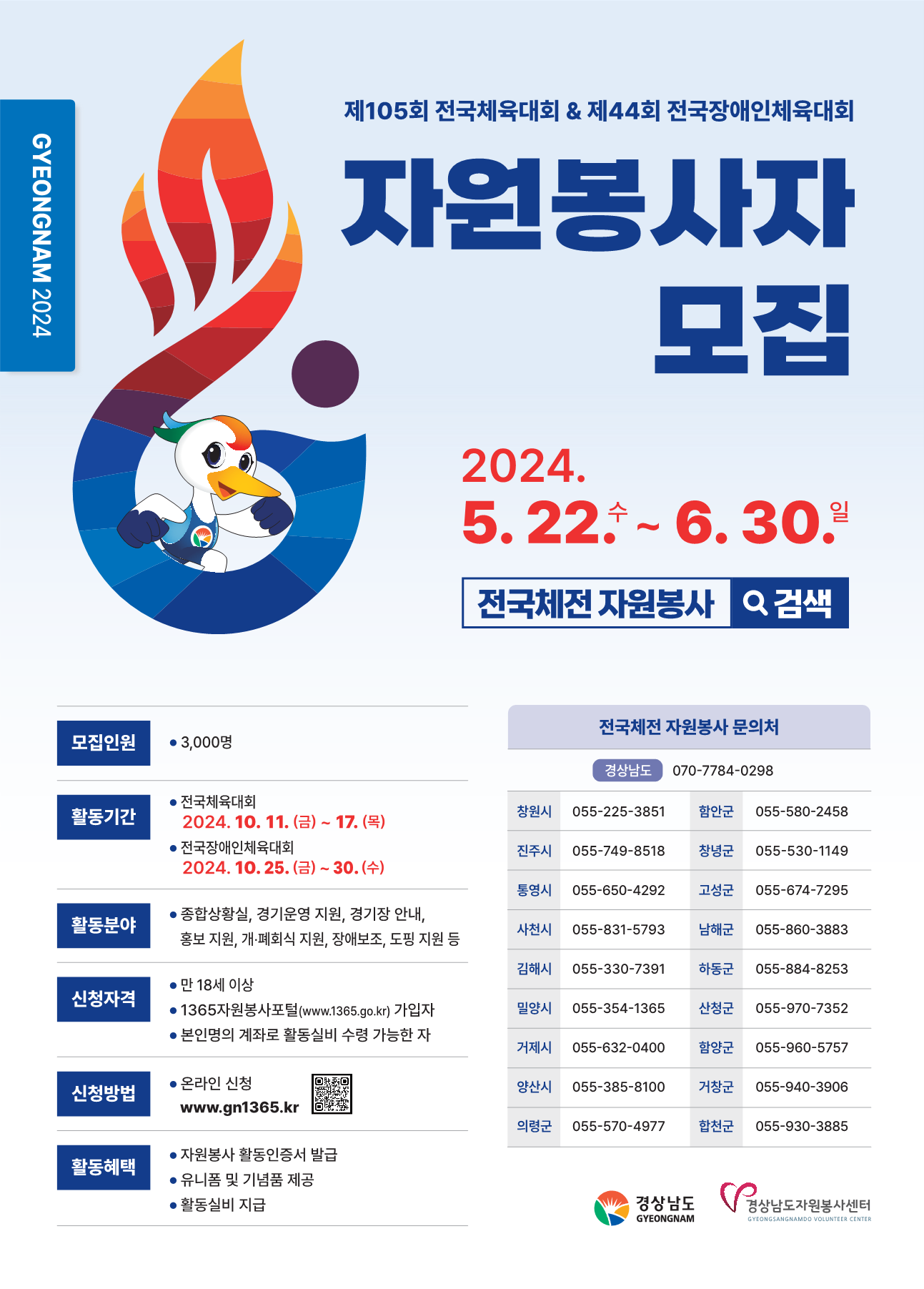 제105회 전국체육대회 & 제44회 전국장애인체육대회를 빛낼 자원봉사자를 적극 모집합니다.