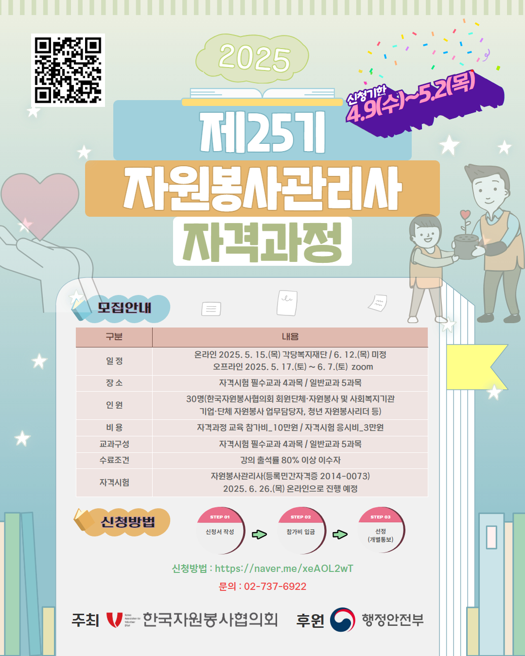정보공유 [홍보] 2025 제25기 자원봉사관리사 자격과정 수강생 모집 안내 관리자 2025.04.14 627 한국자원봉사협의회에서 2025년 제25기 자원봉사관리사 자격과정을 아래와 같이 운영하오니 많은 관심과 참여 부탁드립니다. 이전글 [홍보] 2025년 이해충돌 한마디 공모전 개최 안내 목록 다음글 [홍보] 2025년도 한국사회복지사협회 제2회 사회복지사 논문 경진대회 참여 안내