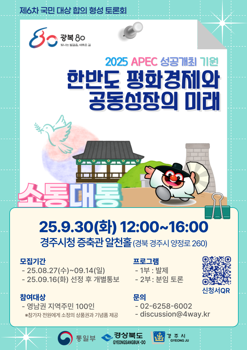 정보공유 [홍보] 2025년 제6차 국민 대상 합의 형성 사업 행사 안내 관리자 2025.08.29 135 이전글 [홍보] '2025 강원방문의 해' 맞이 강원 삼척시 '오고 또 오고' 캠페인 안내 목록 다음글 [홍보] 한국자원봉사센터협회보 제14호 발행 안내