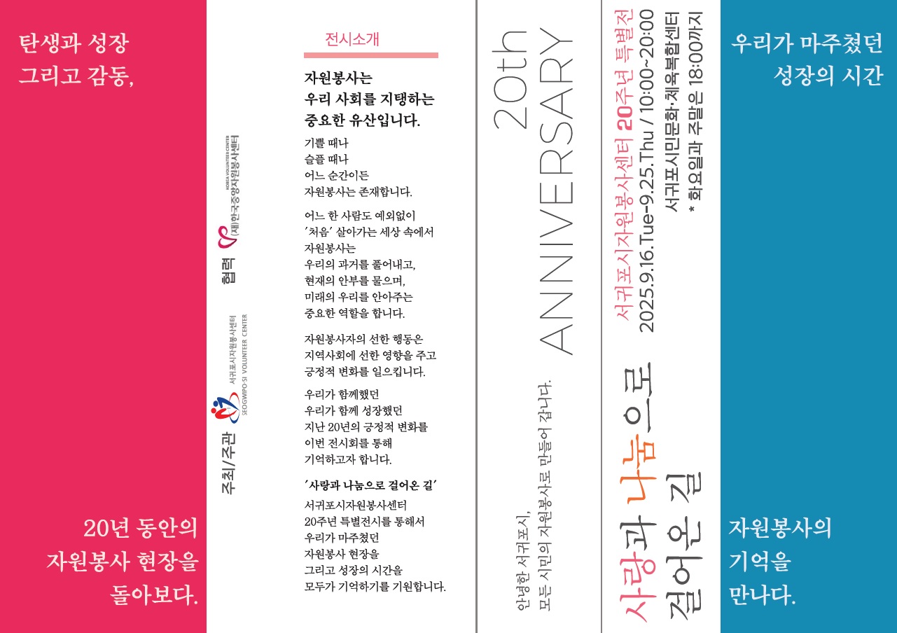 정보공유 [홍보] 서귀포시자원봉사센터 20주년 기념 행사 안내 관리자 2025.09.03 128 이전글 [홍보] (중앙사회서비스원) 2025년 제2차 '사회서비스 정책포럼' 안내 목록 다음글 [홍보] 2025 영동세계국악엑스포 개최 안내