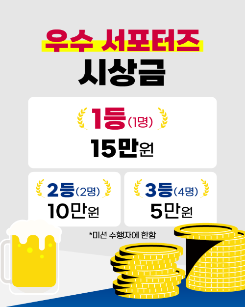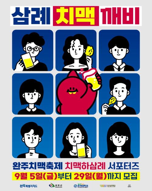 정보공유 [홍보] 2025 전북특별자치도 완주군 삼례 맥주축제 <치맥하삼:례> 서포터즈 모집 안내 관리자 2025.09.23 37 이전글 [홍보] 2025 국민참여 청렴콘텐츠 공모전 국민투표 및 표절제보 안내 목록 다음글 [홍보] 추석 명절 청탁금지법 선물 가능 범위 안내