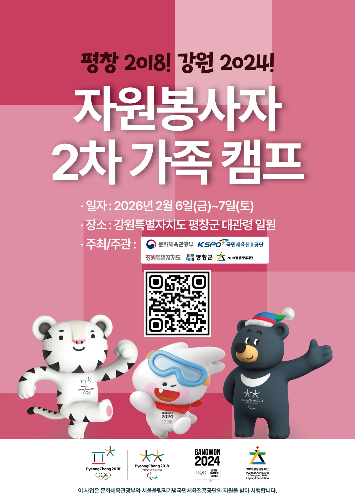 정보공유 [홍보] 2025-2026 수호랑 반다비 자원봉사자 가족 캠프 사업 홍보 관리자 2026.02.02 145 2025-2026 수호랑 반다비 자원봉사자 가족 캠프 기본계획(안) .pdf 이전글 [홍보] 2026 한강공원 자원봉사자 모집 안내 목록 다음글 [홍보] 2026 제2회 시민인디컨퍼런스 ‘그 경계(The Boundary)’ 참여 안내