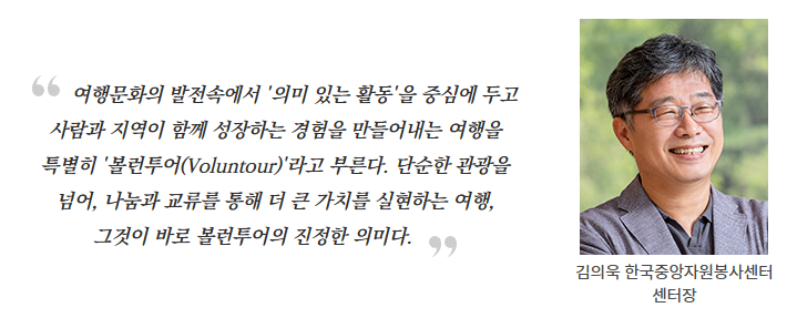 이러한 여행문화의 발전속에서 '의미 있는 활동'을 중심에 두고 사람과 지역이 함께 성장하는 경험을 만들어내는 여행을 특별히 '볼런투어(Voluntour)'라고 부른다. 단순한 관광을 넘어, 나눔과 교류를 통해 더 큰 가치를 실현하는 여행, 그것이 바로 볼런투어의 진정한 의미다.