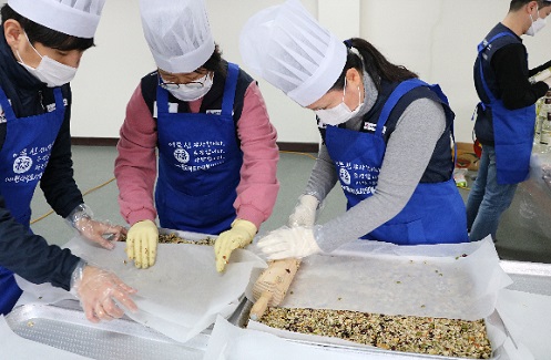 지난 5일 자원봉사자들이 전라북도 선별진료소 의료진을 위한 사랑의 간식을 만들고 있는 모습