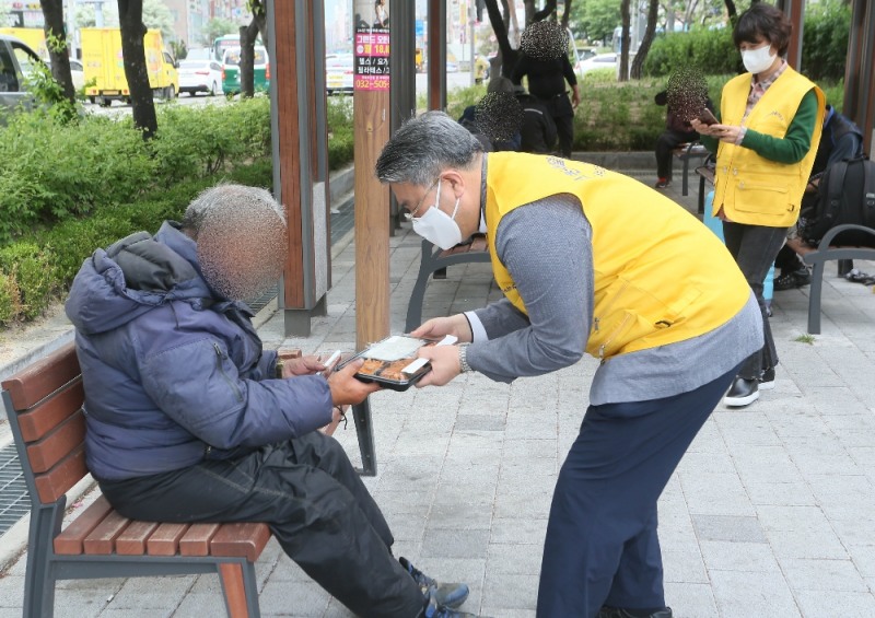 한국중앙자원봉사센터와 인천내일을여는집은 7일 부평역 광장에서 길거리노숙인을 대상으로 도시락과 개인위생용품이 들어있는 파우치를 전달하는 행사를 가졌다. 사진=양윤모 기자
