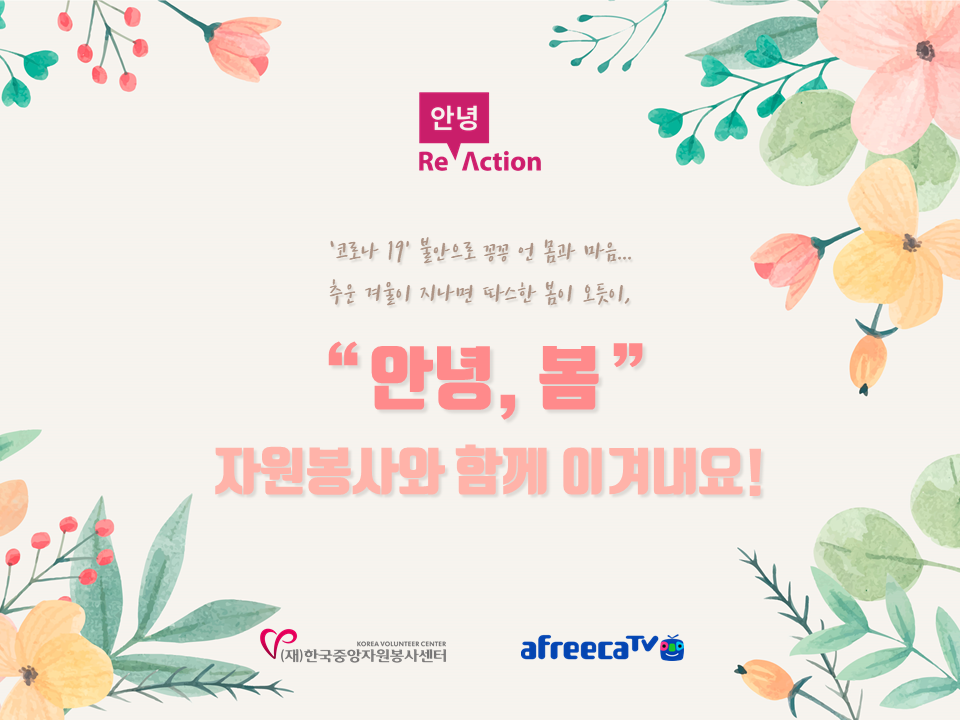 ▲ 한국중앙자원봉사센터는 오는 16일까지 아프리카TV(대표이사 정찬용)와 '안녕 봄 캠페인'과 관련한 콘텐츠 제작 이벤트를 진행한다고 12일 밝혔다.