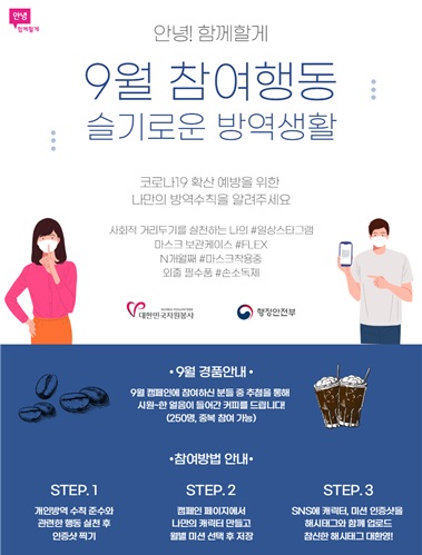 이와 관련해 한국중앙자원봉사센터는 소셜네트워크서비스(SNS)를 중심으로 진행되는 온라인 캠페인의 9월 대국민 참여행동으로 '슬기로운 방역생활'을 제안했다. 이번 주제는 코로나19 확산 예방에 초점을 맞추어 제안된 것으로 개인방역 수칙준수와 관련된 다양한 행동들로 구성돼 있다.