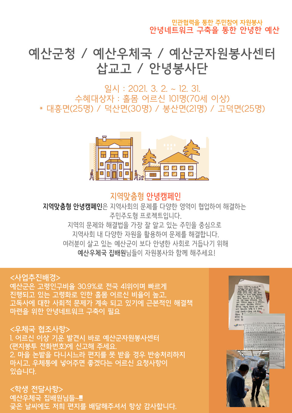 두 번째 <안녕한 예산-안부편지>는 청소년 자원봉사자와 어르신이 1대1로 매칭하여 월 2회 안부편지를 통한