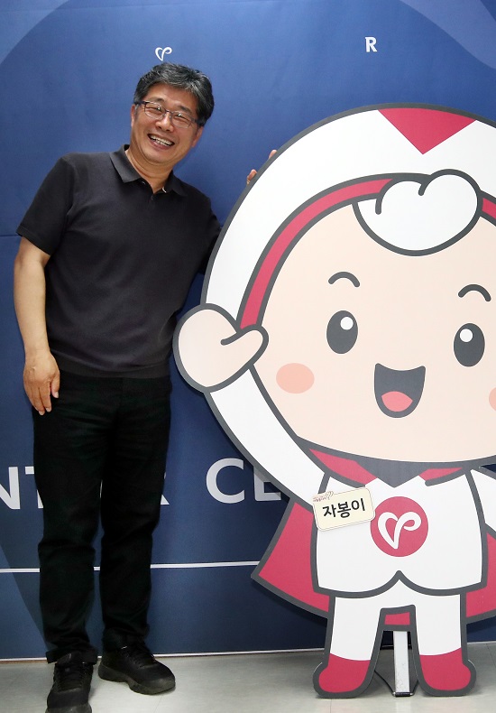 ▲ 한국중앙자원봉사센터의 마스코트 자봉이와 다정하게 포즈를 취한 김의욱 센터장. Ⓒ스카이데일리