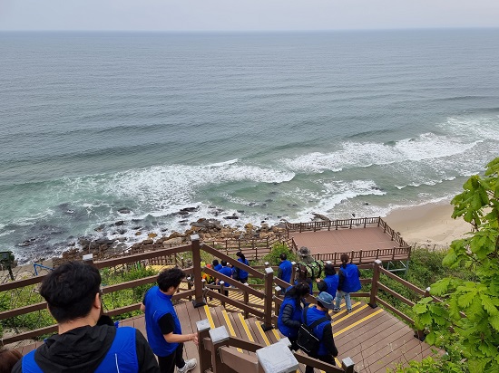 ▲ ‘코리아둘레길- 평화의 길 고성A 코스’ 해안전망대로 내려서고 있는 탐방객들. 임유이 기자