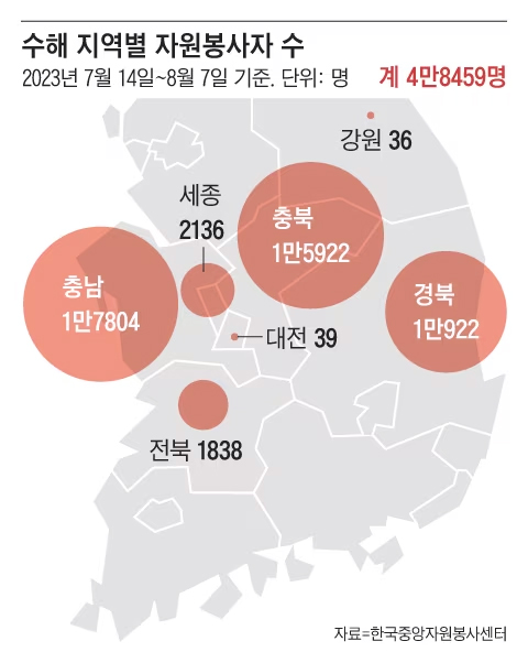 25일간 5만명이 움직였다. 지난 7월 14일부터 8월 7일까지 한 달도 채 안 되는 짧은 기간. 폭우로 피해를 입은 지역의 수해복구를 돕기 위해 전국 각지에서 5만명의 자원봉사자가 모였다. 지난 한 해 국내 재난 대응에 투입된 자원봉사자 수가 7만명이었다는 것을 감안하면 이례적인 숫자다.