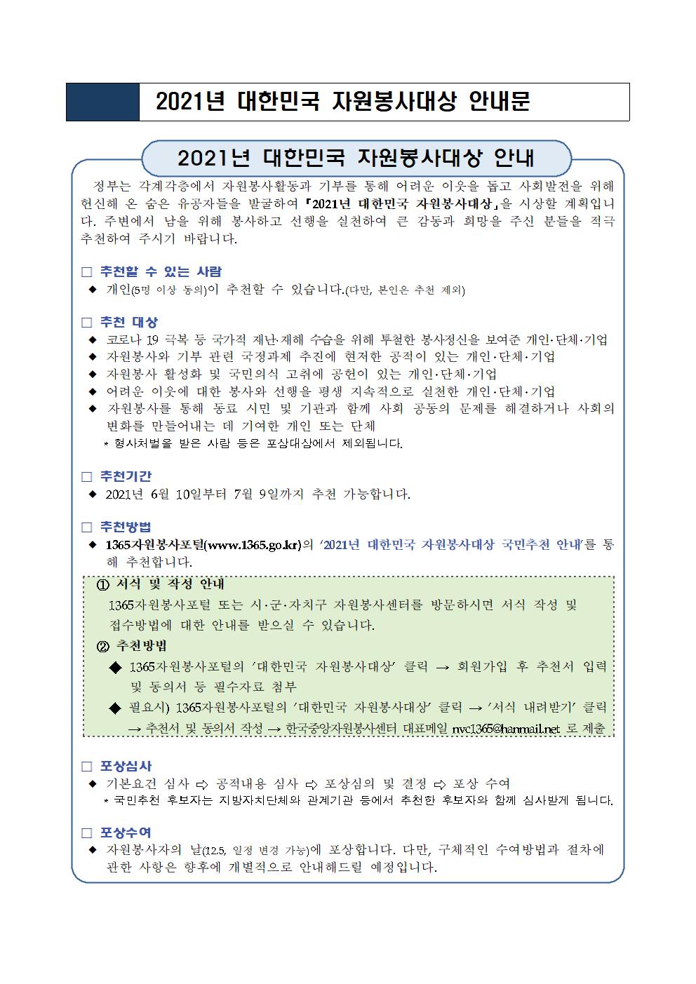 공지사항 [안내] 2021년 대한민국 자원봉사대상 국민추천 후보자 모집 2021.06.10 관리자 붙임1. 2021년 대한민국 자원봉사대상 추진계획.hwp 이전글 이그나이트 V-Korea 우수사례 1차 서류 심사 우수사례선정 결과입니다. 목록 다음글 (공고 제2021-010호) 2021 청년 주도형 안녕캠페인 공모사업 선정결과 공고