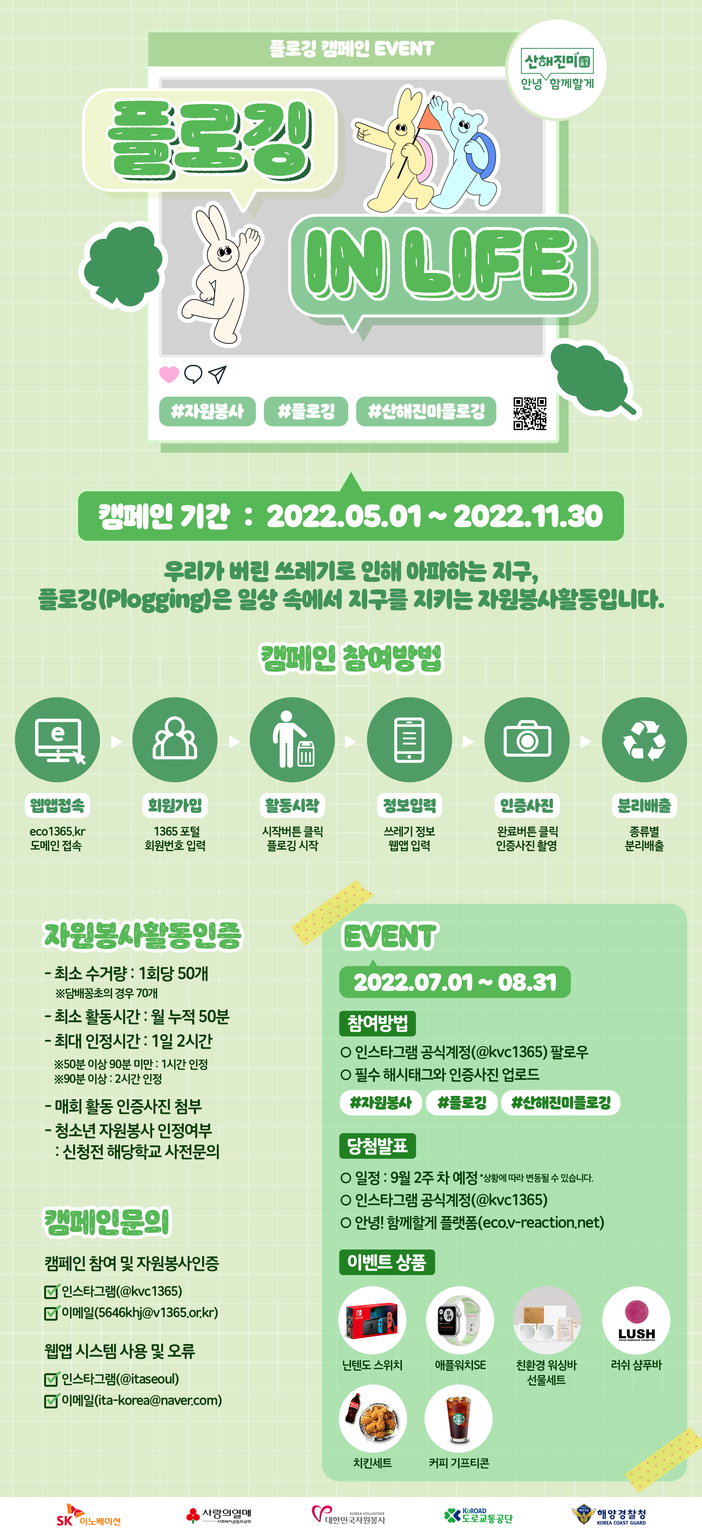 공지사항 [공지] 범국민 플로깅 캠페인 참여 이벤트 : 2회차 2022.07.01 관리자 이전글 [공지] 코리아둘레길 플로깅 캠페인 참여 이벤트 목록 다음글 [공지] 자원봉사 캐릭터 및 이름 선정을 위한 설문조사