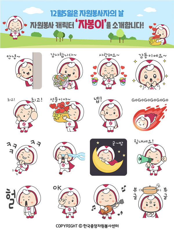 한국중앙자원봉사센터에서는 「자원봉사자의 날」과 「자원봉사주간」을 기념해 대한민국 자원봉사 캐릭터 「자봉이」를 활용한 카카오톡 이모티콘을 제작해 배포 합니다.