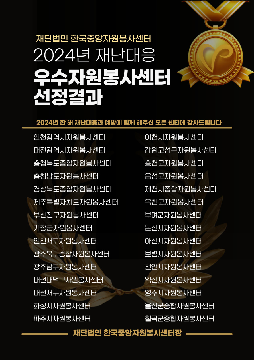2024년 재난대응 우수자원봉사센터 선정 결과를 안내해드립니다.