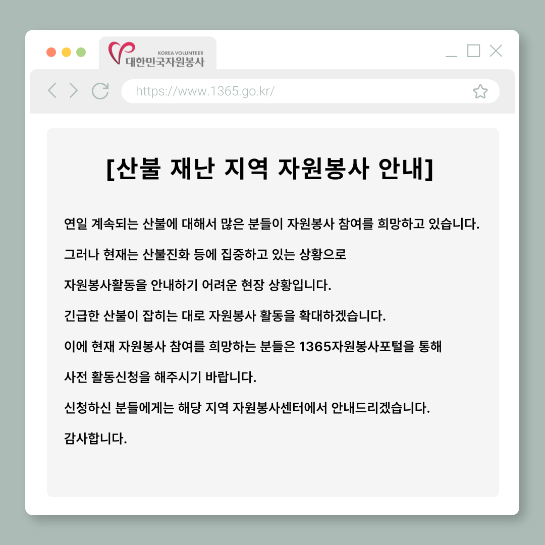 현재는 산불진화 등에 집중하고 있는 상황으로 자원봉사 활동을 안내하기 어려운 현장 상황입니다.