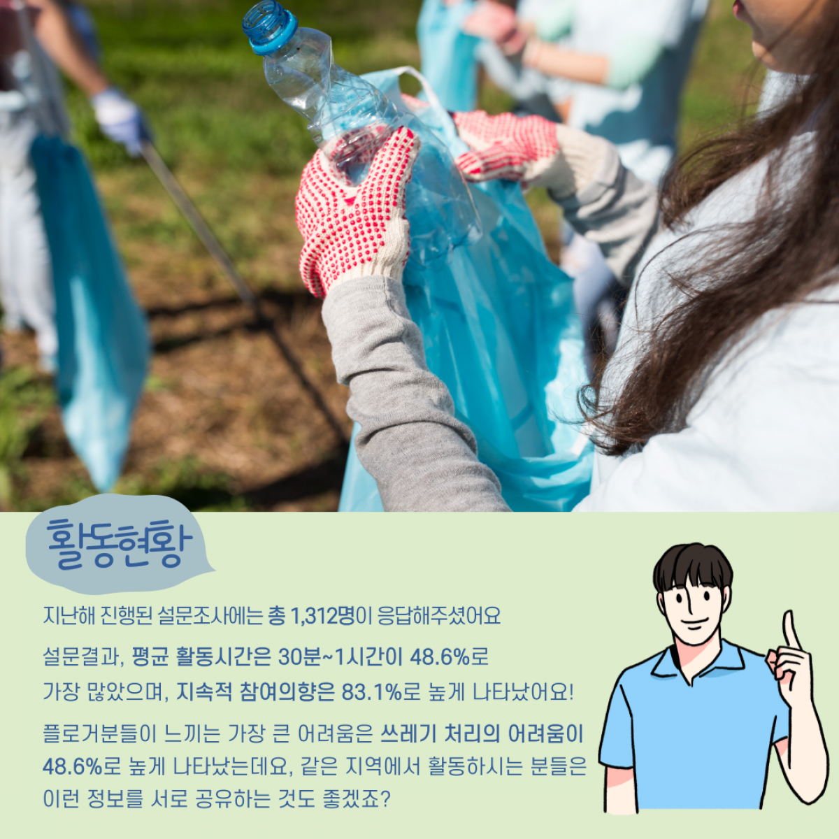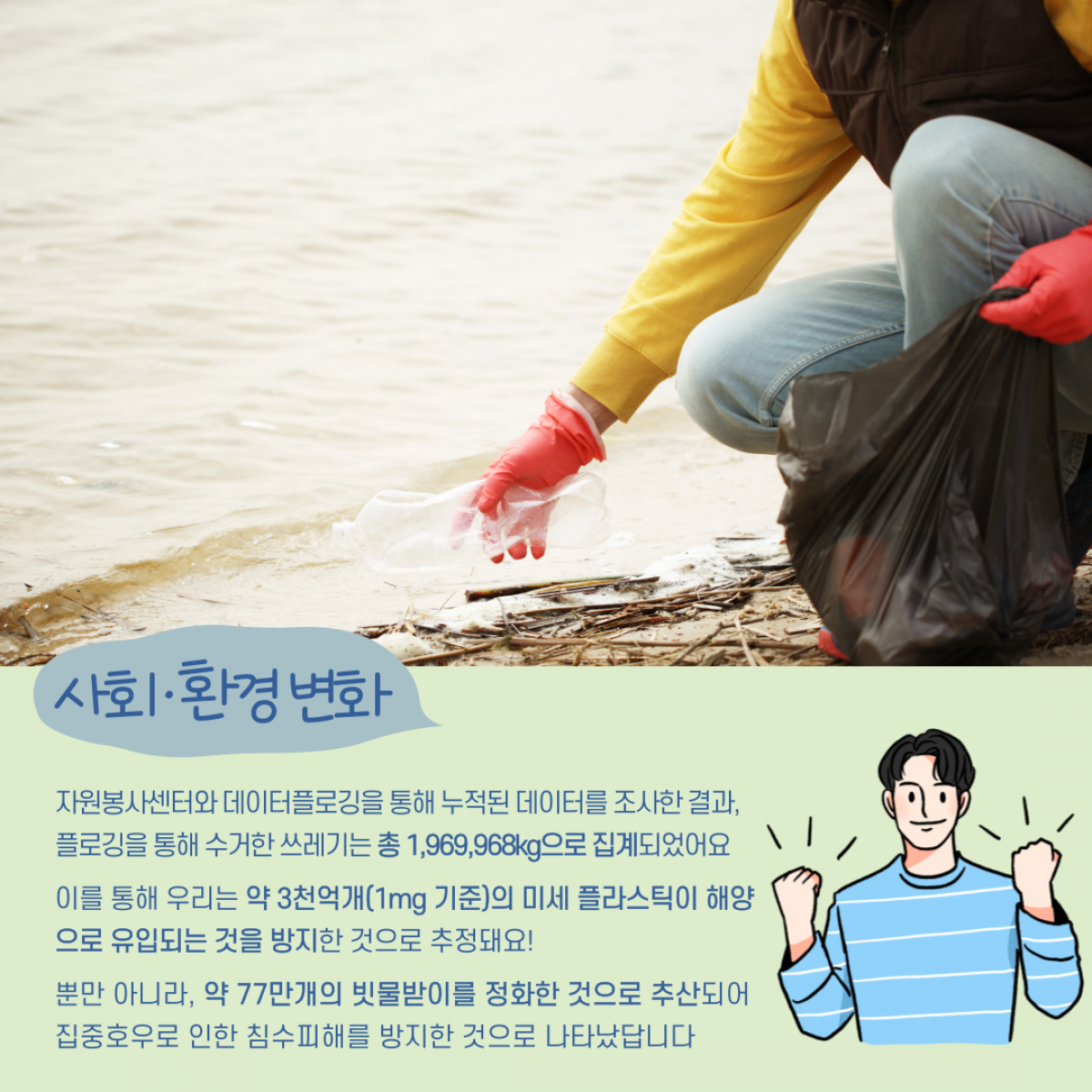 공지사항 [공지] 2022 범국민 플로깅 캠페인 총 결산 2023.03.08 관리자 2022 범국민 플로깅 캠페인 성과 분석보고서.pdf 이전글 [공지] 사회문제 해결형 자원봉사 지원사업 『스케일업(Scale-up) 프로젝트』 공모 안내 목록 다음글 [포상] 2023년 「국가 재난관리 유공」 정부 포상 후보자 공개 검증
