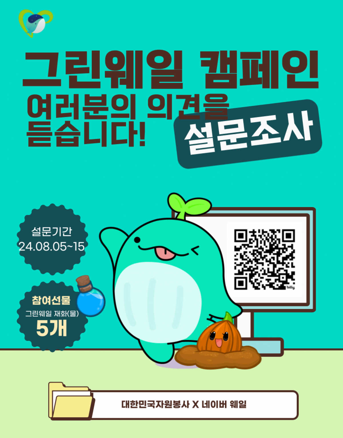 이번 조사는 ‘그린웨일 앱’을 경험한 시민을 대상으로 진행되며, 이용현황, 만족도 및 개선 사항, 의식 및 행동변화 등을 확인하기 위해 진행됩니다.