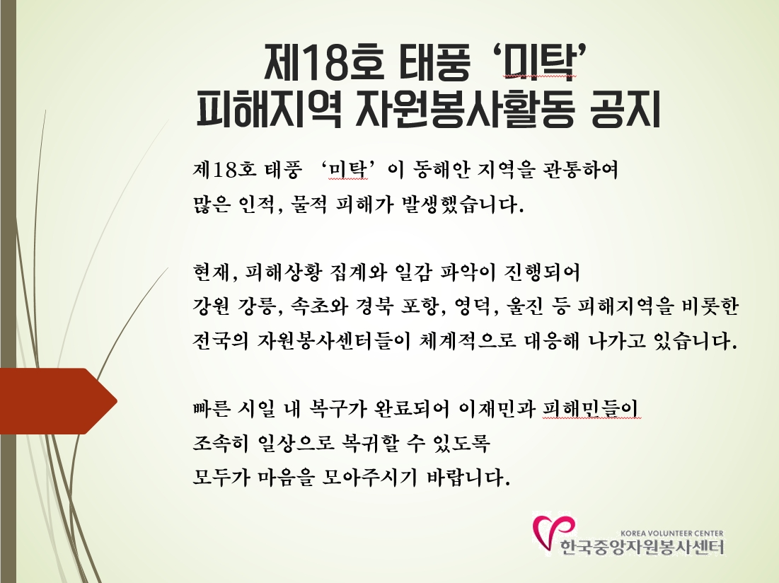 공지사항 [공지] 제18호 태풍 '미탁' 피해지역 자원봉사활동 공지 2019.10.03 관리자 이전글 [공지] 2019 안녕 캠페인 우수사례 경진대회 심사결과 알림 목록 다음글 [공지] '자원봉사 안녕체' 대상과 사용범위 알고 사용하기!