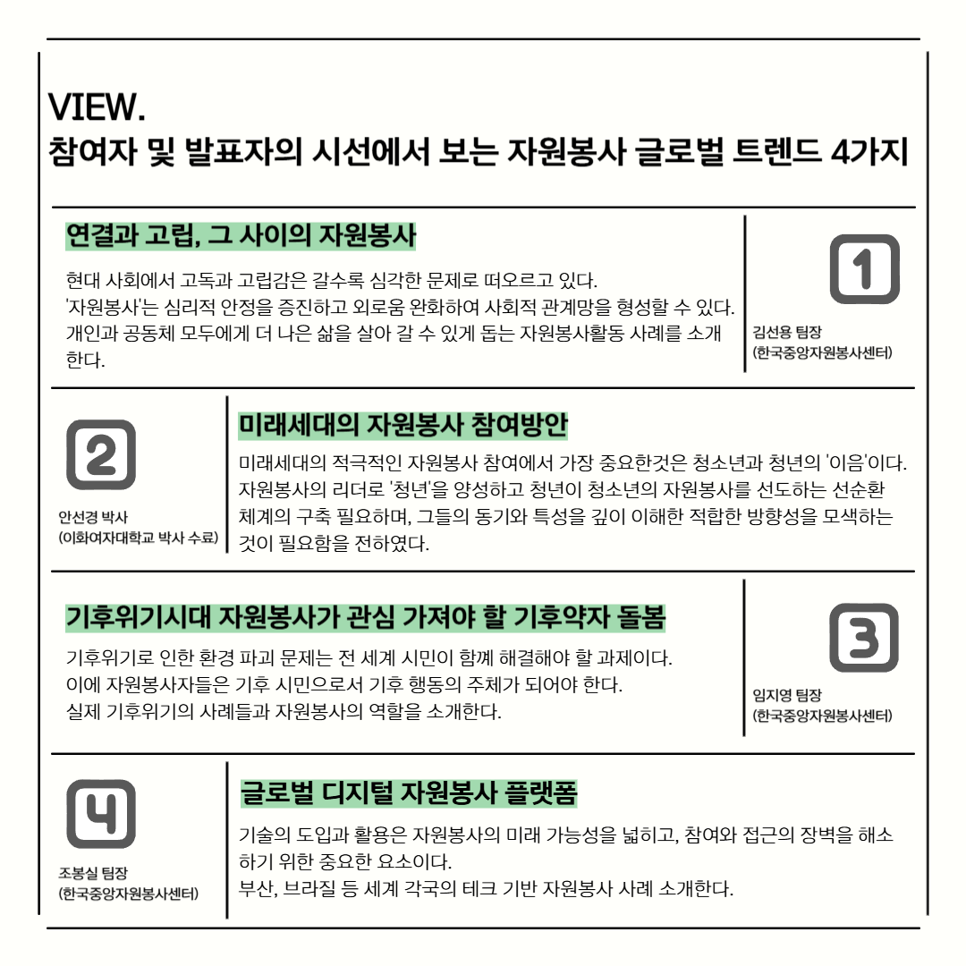 지속가능한 미래를 만들기 위한 자원봉사의 역할, 변화의 중요한 지점들, 그리고 대회를 통해 발견된 글로벌 자원봉사 트렌드와 생생한 비하인드 스토리까지 담았습니다.