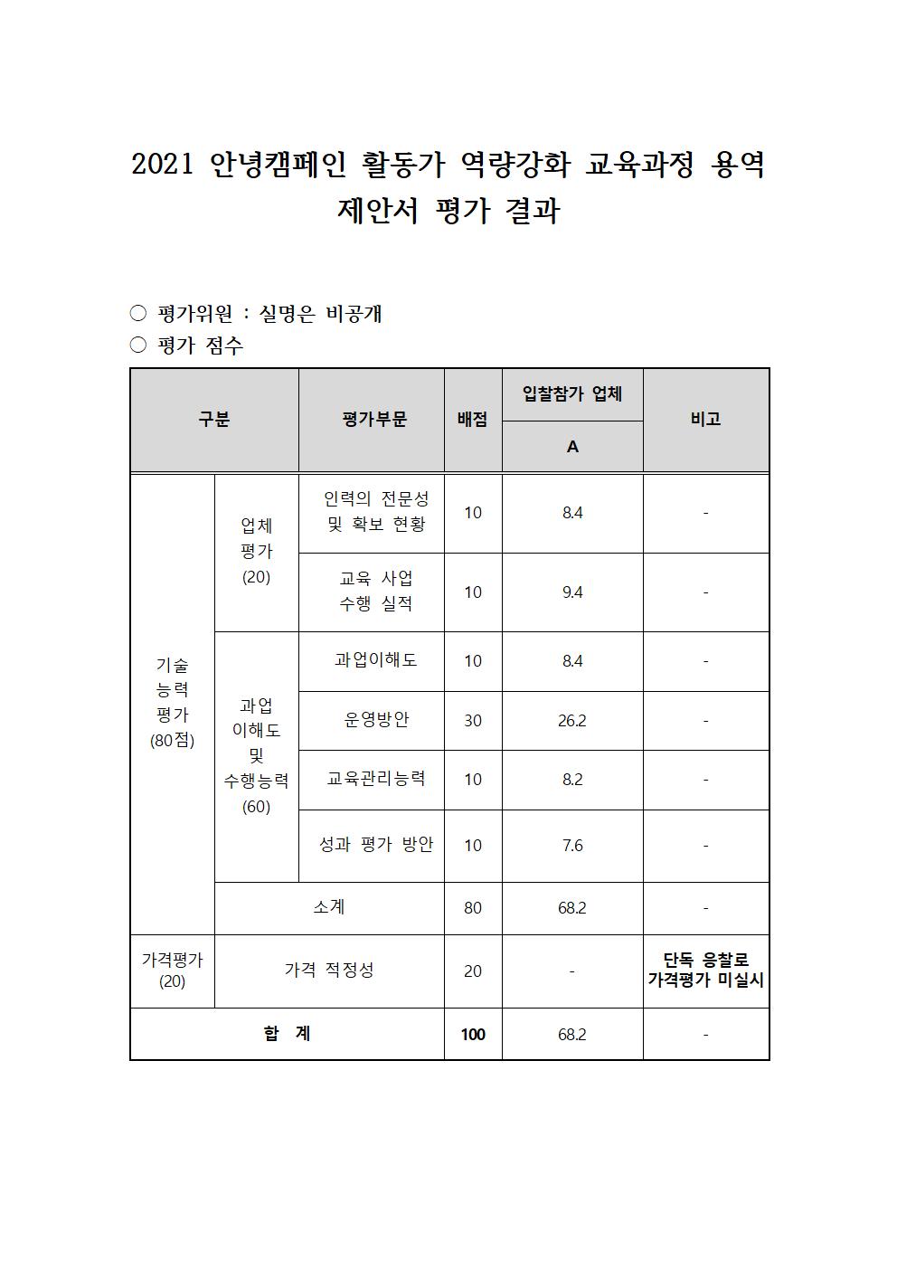 입찰/채용 (공고 제2021-013호) 2021 안녕캠페인 활동가 역량강화교육과정 운영 용역 제안서 평가 결과 2021.05.26 관리자 2021 안녕캠페인 활동가 역량강화 교육과정 용역 제안서 평가 결과.hwp 이전글 (공고 제2021-018호) 기후위기 대응 안녕! 함께할게 캠페인 운영 용역 재공고 목록 다음글 (공고 제2021-017호) 우수사례 공모대회 자원봉사 이그나이트 스토리텔링 및 스피치 교육 용역 재공고