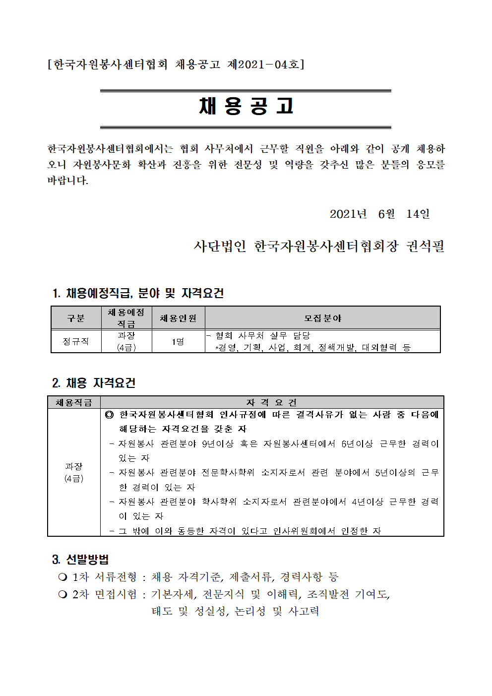 입찰/채용 (채용_홍보) 한국자원봉사센터협회 사무처 경력직 직원 채용 재공고 2021.06.14 관리자 [채용공고 2021-4호] 붙임. 한국자원봉사센터협회 사무처 경력직 직원 채용 재공고문.hwp 이전글 (채용_홍보) 2021 양주시자원봉사센터 직원 채용시험 공고 목록 다음글 (공고 제2021-018호) 기후위기 대응 안녕! 함께할게 캠페인 운영 용역 제안서 평가 결과