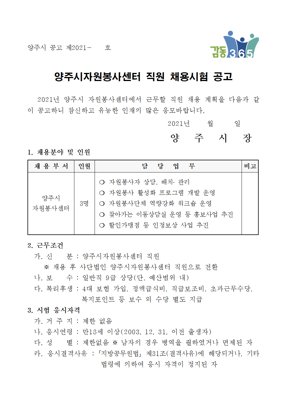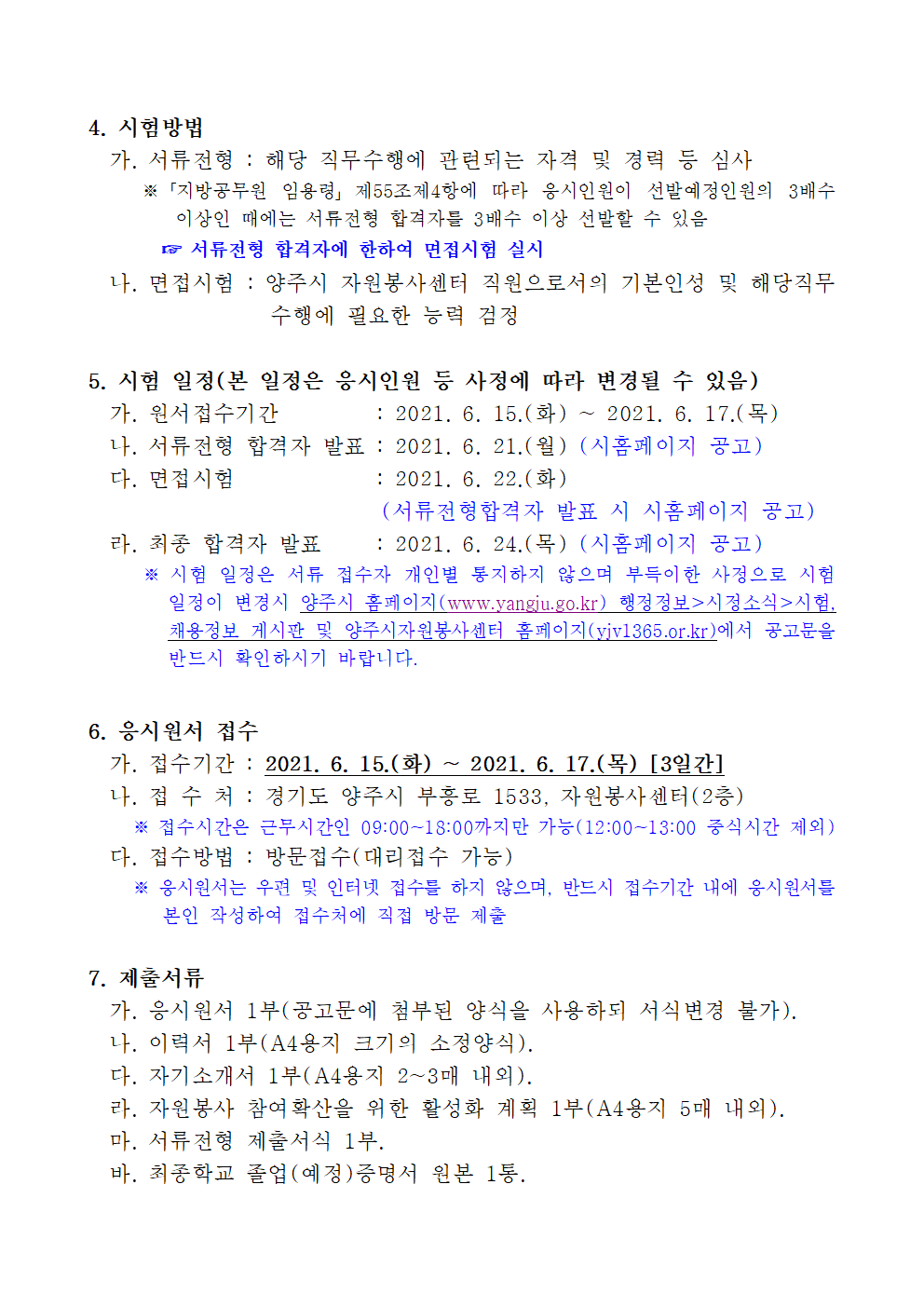 입찰/채용 (채용_홍보) 2021 양주시자원봉사센터 직원 채용시험 공고 2021.06.14 관리자 붙임. 2021 양주시자원봉사센터 직원 채용시험 공고.hwp 이전글 (채용 제2021-003호) 재단법인 한국중앙자원봉사센터 2021년도 제3차 직원 채용 결과 안내 목록 다음글 (채용_홍보) 한국자원봉사센터협회 사무처 경력직 직원 채용 재공고