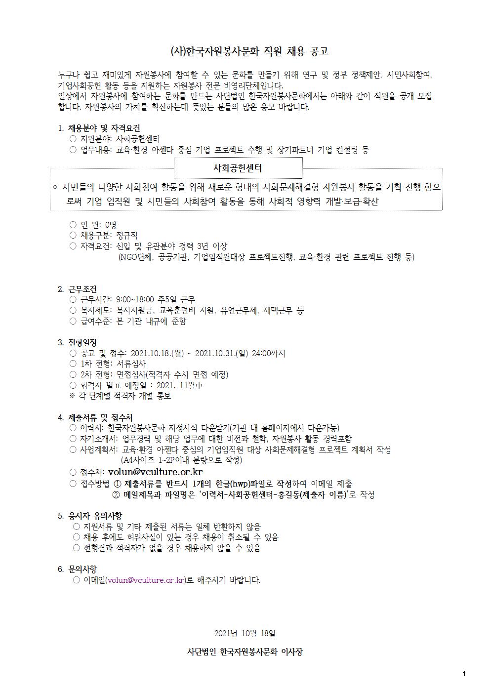 입찰/채용 (채용_홍보) (사)한국자원봉사문화 직원채용공고 2021.10.19 관리자 붙임. 입사지원서, 개인정보제공동의서 양식.hwp 이전글 (채용_홍보) 서울특별시자원봉사센터 비상임 임원 후보자 공개모집 공고 목록 다음글 (공고 제2021-032호) 비대면 프로그램 운영 지원을 위한 태블릿PC 구매 용역 업체 선정결과