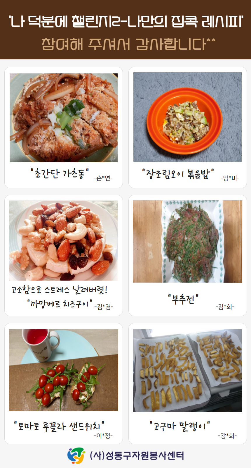 자원봉사자 스토리 [성동구센터]코로나19-나 덕분에 챌린지2 관리자 2020.11.03 1976 [성동구자원봉사센터]에서는 코로나19속에서 간단하고 쉽게 따라 할 수 있는 나만의 홈쿠킹 '나 덕분에 챌린지2-나만의 집콕레시피'를 실시하였습니다. 이전글 [경기 하남시] 안녕! 플라스틱 줄이기 캠페인 목록 다음글 [김해센터]안녕! 함께할게~ 일회용품 싹쓰리~!