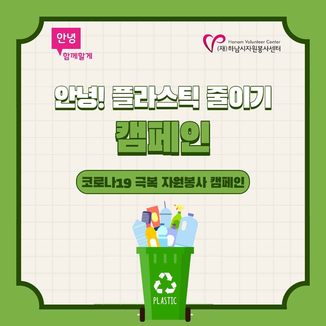 자원봉사자 스토리 [경기 하남시] 안녕! 플라스틱 줄이기 캠페인 관리자 2020.11.04 2059 이전글 [충남 아산시]언택트 자원봉사! 어디까지 해봤니? 안녕! 서로를 지키는 거리 함께 할게! 목록 다음글 [성동구센터]코로나19-나 덕분에 챌린지2